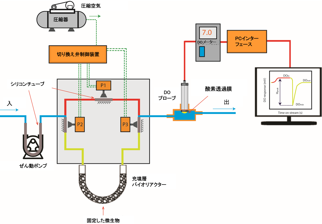 費用がかさむ業務用バイオセンサーとは異なり、BODTOX は対象とする排水に存在する自然の細菌共同体を使いバイオチップ、多孔性セラミックス、軽石などの安価な媒体を組み合わせて、または特定用途の業務用微生物を基にしたアルギン酸ナトリウムカプセルを使い、簡単に自作できる充填層バイオリアクターを基本構造としています。検出システム内での気泡と細菌の蓄積が誤ったDO(溶存酸素)信号と反応を引き起こすおそれがありますが、新しい非接触液体流出システムの使用によりこれを完全に防ぐことが可能です。このため、ぜん動ポンプを使って非接触で流体を送り、流路制御用の3方向電磁弁2個に代えて圧縮器からの圧縮空気で動く空気シリンダー3個を採用しています。その結果、検出テストごとに複雑で時間のかかる清浄を行う必要がありません。加えて、BODTOX は新たに開発した半連続操作モードを使っているため、ピーク型の信号、継続的で迅速なBOD5 推定値測定、毒性測定が可能です。