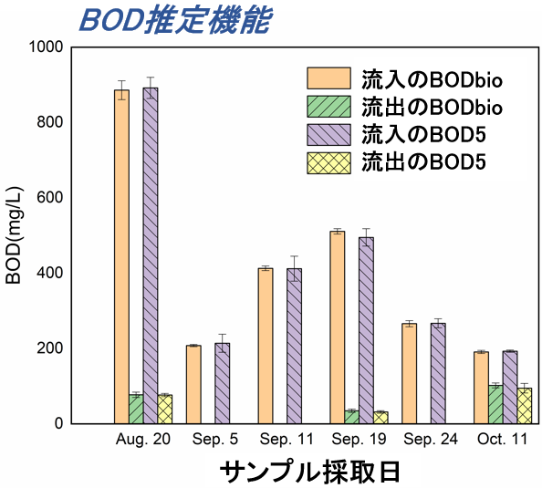 充填層バイオリアクター(PBBR)を基本とするBOD検出システムの概略図と実際の排水のBOD推定値と毒性測定の結果