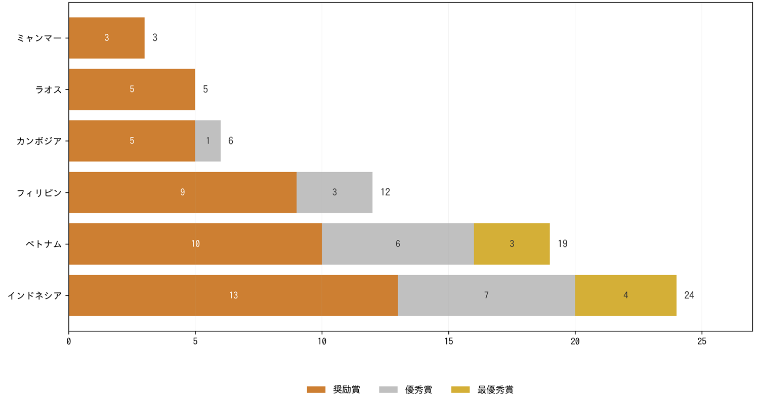 インドネシア、フィリピン、ベトナムに比べ、カンボジア、ラオス、ミャンマーからの応募、受賞数の少ない状況が継続している。このため、応募の少ない国については、小さな成果も丁寧に取り上げていく姿勢を継続して説明し、動向を注視している。