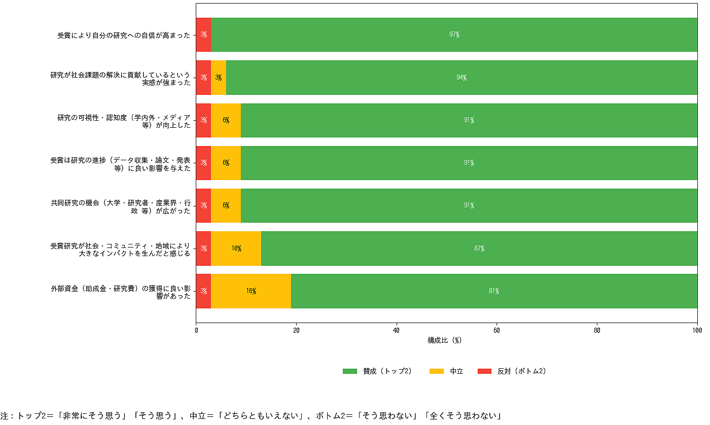 受賞による影響については、図表3のとおり、研究の進捗、外部資金の獲得、共同研究の機会、社会実装の進展、可視性(学内外・メディア等)の向上など、広範な効果が確認されました。定量設問の評価はトップ2(5段階評価のうち「非常にそう思う」「そう思う」の合計)で80〜97%となり、受賞が研究の動機づけや基盤強化に寄与していることが示唆されました(設問例:「研究の可視性・認知度(学内外・メディア等)が高まった」)。また、一部設問では「どちらともいえない」という中立回答も一定数みられ、研究分野や所属機関の制度・環境の違いが影響している可能性も示唆されました。