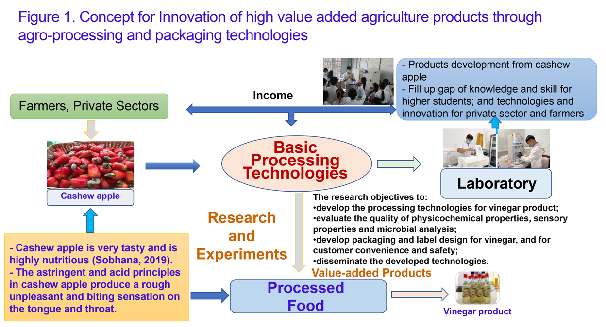 The research study entitled “Innovation of high value added agricultural products through agro-processing and packaging technologies: a case study on vinegar product” generally aims at exploring potential processing technologies for the development of value-added products especially vinegar from cashew apple. Product innovation and packaging technologies suitable for Cambodian food processors’ condition will be developed. The processing models will be used as a guide in food processing management of the envisioned products from cashew apple. Utilization of cashew apple into value-added products after removal of nut will therefore help in the reduction of environmental wastes and increase the income of the local farmers and food processors. The concept of innovation high value added agricultural products through agro-processing and packaging technology was be show as bellow: