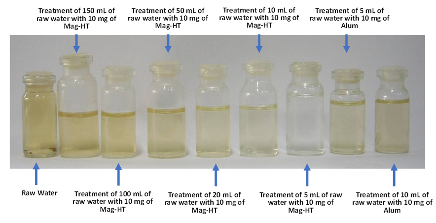 Result of trial test showing the superiority of the synthesized magnetite-hydrotalcite (Mag-HT) in removing dissolved organic compounds (DOCs) from raw water of a drinking water treatment agency
