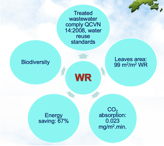 Treated domestic wastewater using WR complied with the national discharge standard and the water reuse standards. WR systems could create high green coverage (99 m2 of green leaf per m2 of the wetland area). Confirm that wetland roof could be an ecological engineering solution for complete treatment of domestic wastewater from the urban buildings or households.