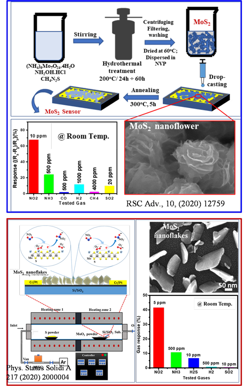 Representative RT NO2 sensor chips based on MoS2 nanoflowers and nanoflakes grown by hydrothermal (top) and CVD (bottom) methods.