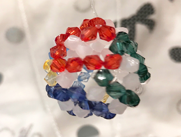 今回のデザインは全て同じ大きさのビーズを使用し、「辺の長さが一定の多面体」をデザインする作業でした。また、一本のワイヤーにビーズを通して立体にするための設計図には、一筆書き理論であるオイラーの定理が使われています。