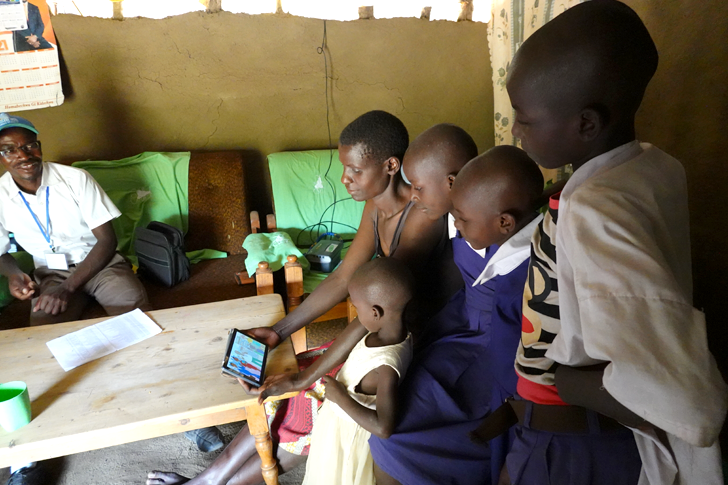 CHVによるタブレット端末を使った住民へのマラリア対策に関する知識啓発、グアシ地区、ホマベイ郡、ケニア